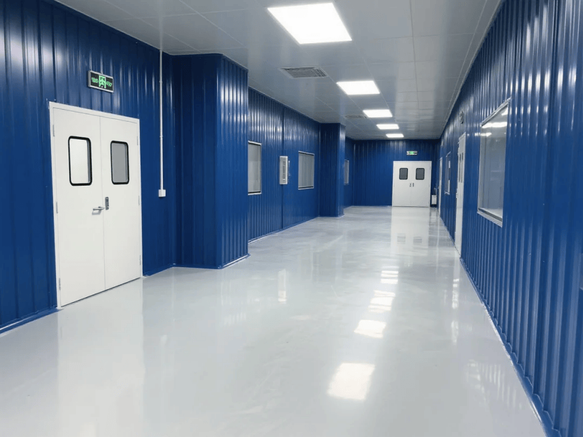 車(chē)間采用模塊化潔凈室結(jié)構(gòu),墻體采用50mm厚深藍(lán)抗菌彩鋼板,接縫處采用圓弧處理工藝。自動(dòng)化沖壓線與激光焊接工作站呈U型交替布局,工作站間設(shè)置深灰不銹鋼傳遞窗,確保物料流轉(zhuǎn)潔凈度。吊頂系統(tǒng)配置FFU高效過(guò)濾單元,維持≥20次/h換氣次數(shù),氣流組織采用頂送側(cè)回模式。