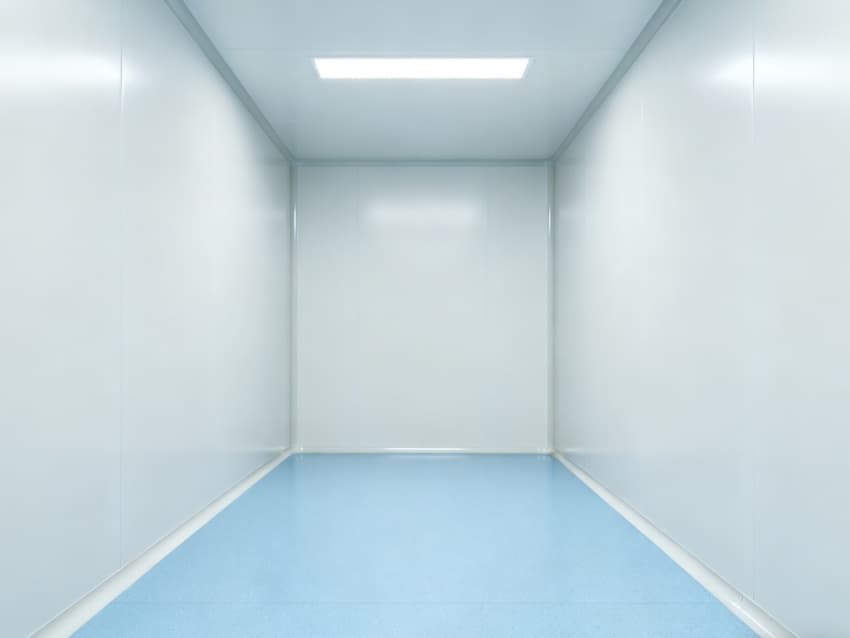 內部按功能劃分為六大潔凈區域:核心潔凈生產區(淺藍色防滑防霉地面)預留開闊空間,滿足發酵罐、純化設備等后期安裝;頂部潔凈送風區通過規整風閥系統,實現萬級潔凈度均勻送風;墻面過渡區采用圓弧轉角設計,避免粉塵堆積;密閉觀察區設雙層鋼化觀察窗,兼顧生產監控與無菌隔離;縱向設備預留區保留8米凈高,適配大型凍干設備動線;輔助緩沖區銜接車間入口,搭配風淋系統,實現人員/物料潔凈過渡。整體空曠布局既保障潔凈操作空間,又滿足皖北生物制藥企業靈活擴產需求,為本地藥企提供合規、高效的生產載體。