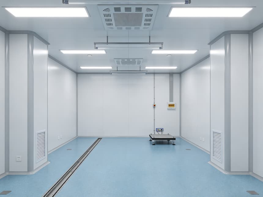 電子光學(xué)車間內(nèi)部細(xì)節(jié)設(shè)計精準(zhǔn)匹配行業(yè)核心需求,整體采用淺藍(lán)色防靜電潔凈地坪與白色無縫潔凈墻面的組合,風(fēng)格簡約統(tǒng)一。地面選用3mm厚環(huán)氧防靜電材質(zhì),表面經(jīng)啞光工藝處理,既能有效規(guī)避強(qiáng)光反射對光學(xué)檢測造成的干擾,又具備10?-10?Ω的穩(wěn)定防靜電性能;同時兼具優(yōu)異的耐磨特性,可耐受酒精等常用清潔劑擦拭,墻角均采用50mm圓弧設(shè)計,從根源上消除積塵死角,筑牢潔凈基礎(chǔ)。
