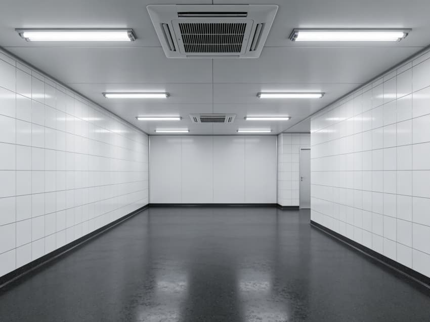 車間內(nèi)部施工工藝凸顯耐腐潔凈特性:地面采用深灰色重防腐環(huán)氧自流平工藝,經(jīng)基層噴砂處理、防腐底漆涂刷、環(huán)氧砂漿找平、自流平罩面四道關(guān)鍵工序,表面平整度誤差≤1mm/m,耐酸堿、耐有機(jī)溶劑腐蝕,附著力達(dá)2.0MPa以上;墻面采用白色食品級(jí)潔凈抗菌涂層施工,推行無(wú)縫拼接技術(shù),陰陽(yáng)角采用R50圓弧倒角工藝,杜絕積塵死角,涂層硬度達(dá)2H,可耐受高頻次消殺。