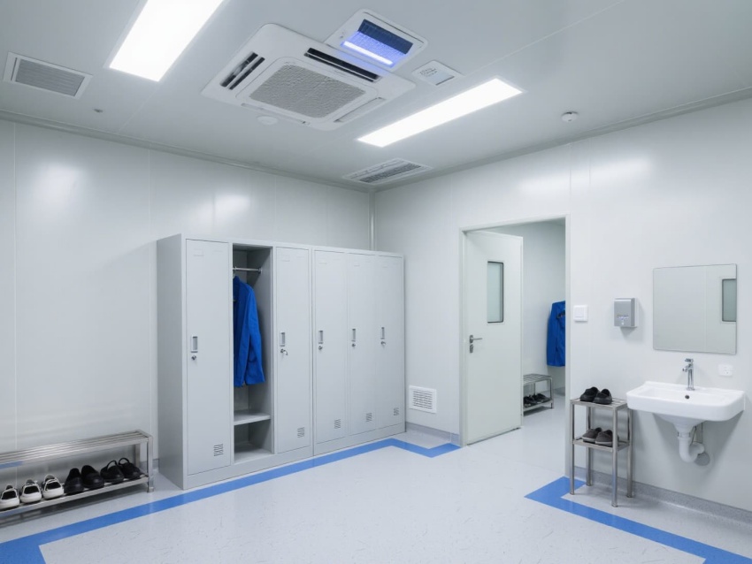 PCR實(shí)驗(yàn)室是基因擴(kuò)增與檢測的核心場所,嚴(yán)格遵循生物安全與潔凈標(biāo)準(zhǔn)。整體以灰白色抗菌彩鋼板為主體,搭配淺藍(lán)色防靜電地坪,通過藍(lán)色標(biāo)識線清晰劃分試劑準(zhǔn)備、樣本制備、擴(kuò)增分析等獨(dú)立區(qū)域,形成單向流布局以防交叉污染。