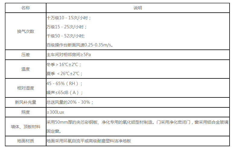 由于制程工藝特殊性,所要求的送、排風(fēng)、送、排水管道多,且風(fēng)量大,因此建議車間的層高為5-6m,其中車間的吊頂高度為3.0m