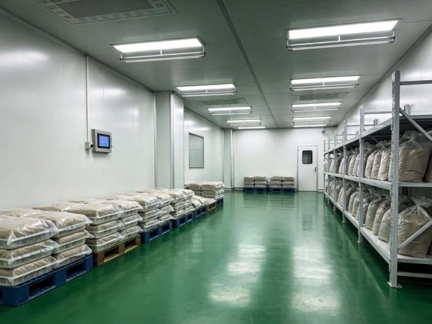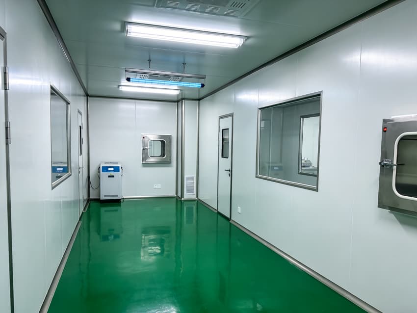 整體空間采用醫藥級潔凈圍護體系:墻面與頂板選用抗菌型潔凈彩鋼板,搭配圓弧角收邊與密封膠條,徹底消除積塵死角;地面為綠色防靜電環氧自流平材質,表面光滑耐磨、易清潔消毒,同時具備靜電消散功能,避免靜電對藥品的潛在影響。吊頂集成 FFU 風機過濾單元與恒溫恒濕控制系統,可穩定維持十萬級潔凈度與 18-26℃的工藝環境,通過壓差管控保障各區域空氣單向流動,有效防止交叉污染。