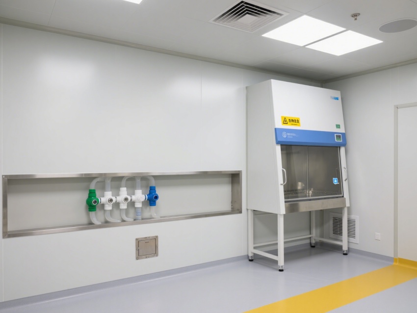 內部設施專業且完善,生物安全柜為實驗操作提供無菌防護;各類氣路、水路接口布局規范,滿足檢測過程的資源供應;配備應急沖眼設施與生物危害廢液處理區,保障實驗安全。空間設計注重潔凈與防護,墻面、地面為無縫抗菌材質,便于消毒滅菌,黃色警示線清晰劃分功能區域,各類監控儀表實時顯示溫濕度、壓差等關鍵參數,確保實驗環境穩定可控。