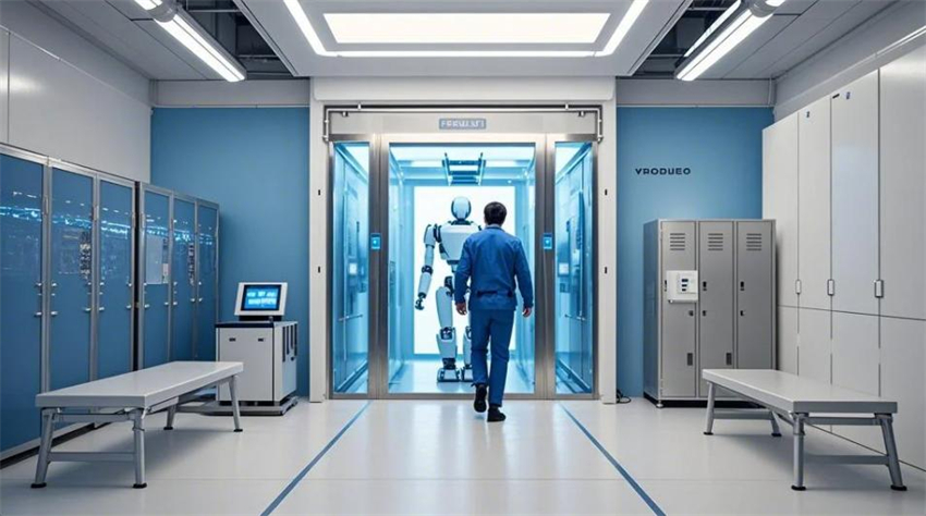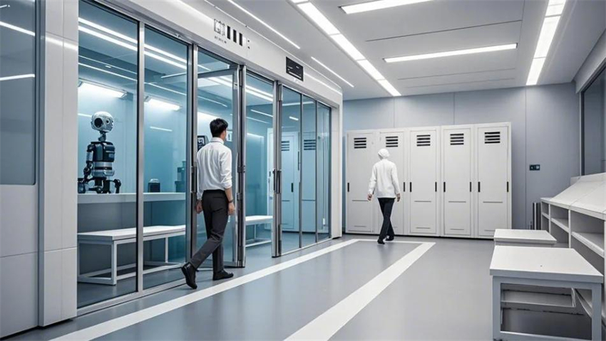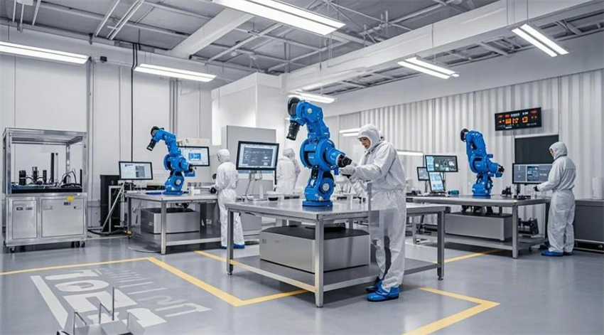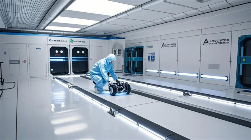 機(jī)械人研發(fā)實(shí)驗(yàn)室,未來科技風(fēng)格。實(shí)驗(yàn)室分為研發(fā)區(qū)、測試區(qū)、裝配區(qū)和辦公區(qū)。研發(fā)區(qū)占50%,測試區(qū)占30%,裝配區(qū)占10%,辦公區(qū)占10%。研發(fā)區(qū):防靜電環(huán)氧地坪(淺灰色),白色彩鋼板墻面和天花板,頂部高效過濾器(HEPA),不銹鋼工作臺(tái),機(jī)械人原型和3D打印機(jī)排列整齊。測試區(qū):機(jī)械人測試平臺(tái),地面為防靜電PVC地板(淺色)。裝配區(qū):工具架整齊,機(jī)械人部件分類存放。辦公區(qū):玻璃隔斷,現(xiàn)代簡約辦公桌。整體色彩:白色、淺灰色、科技藍(lán)點(diǎn)綴。