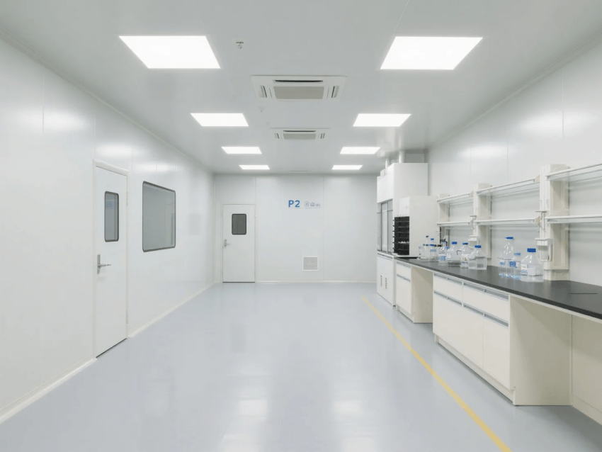 本實驗室嚴格遵循《生物安全實驗室建筑技術規范》GB50346標準,以"科技純凈"為設計理念,通過象牙白彩鋼板墻體與淺灰環氧樹脂地坪的極簡組合,打造符合P2防護要求的現代化研發空間。